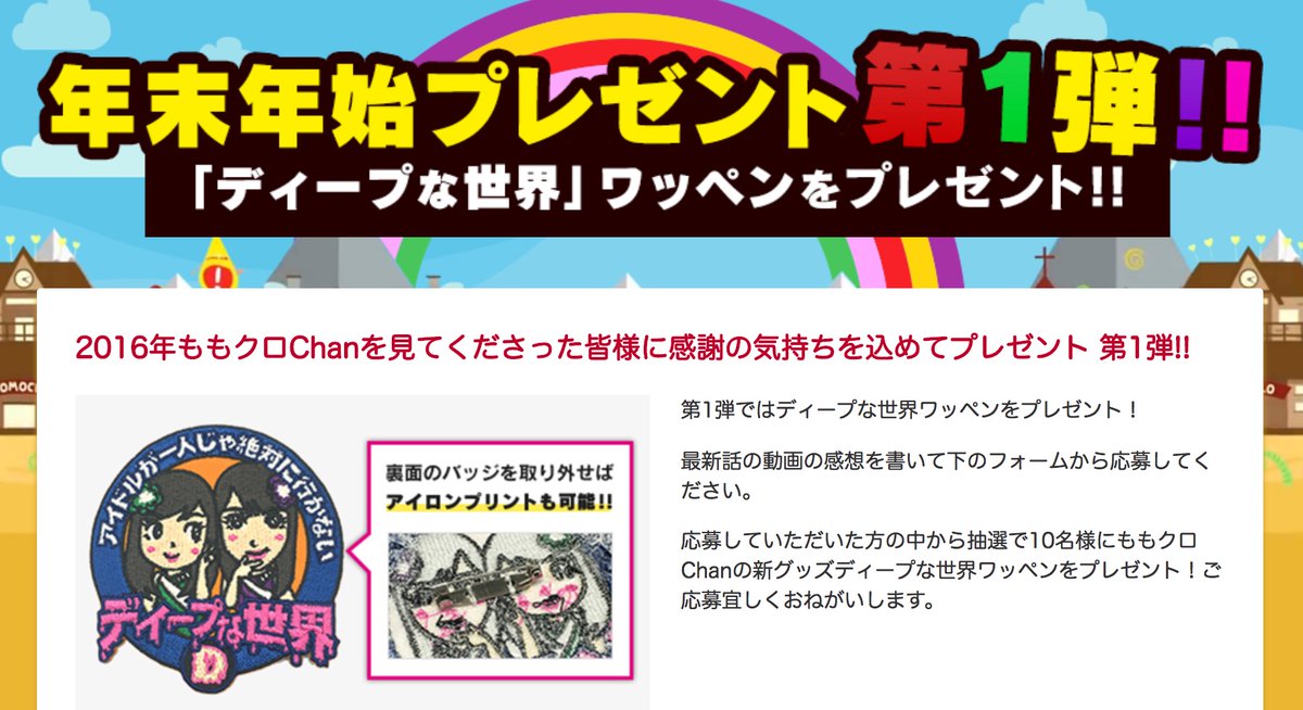 ももクロChan『感謝の気持ちを込めて “プレゼント企画 第... 2016年12月31日 カテゴリ:ももクロ侍 ももクロChan『感謝の気持ちを込めて “プレゼント企画 第1弾” 開催中!!』“ディープな世界ワッペン” を10名様に…(^^) #momoclo https://t.co/LeUPnqiHGl https://t.co/dFcz7Odzpv