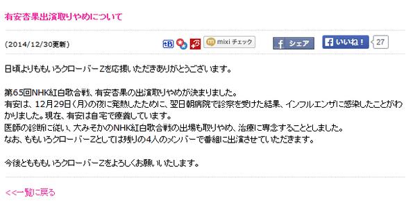 【12/30】ももクロ話題まとめ「有安杏果 インフルエンザで... 2014年12月30日 カテゴリ:まとめノフ(3) 【12/30】ももクロ話題まとめ「有安杏果 インフルエンザで紅白出演取りやめ」 http://t.co/Mxi61bQagK #momoclo http://t.co/A5Dd4uAurV
